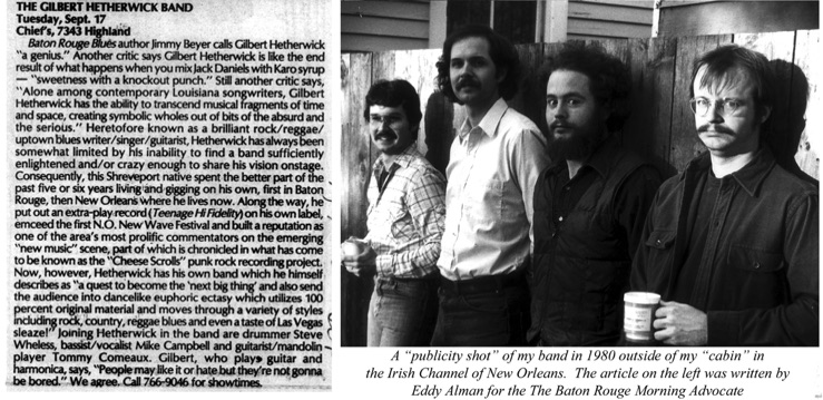 I had a GREAT band for a couple of years featuring the legendary Tommy Comeaux as multi-instrumentalist on guitar, mandolin, saxophone, and pedal steel.  When our manager at the time saw this publicity photo he said... "You look like convicts!"  The band also featured the amazing "Charlie Watts type precision" drumming of Steve Wheless.  Steve held my insanity back in the same way that Charlie Watts does with Keith Richards.   It gave us an edge.   Here is some of our publicity and a sound file of us opening up for Johnny Winter at a New Orleans club called "Old Man River".