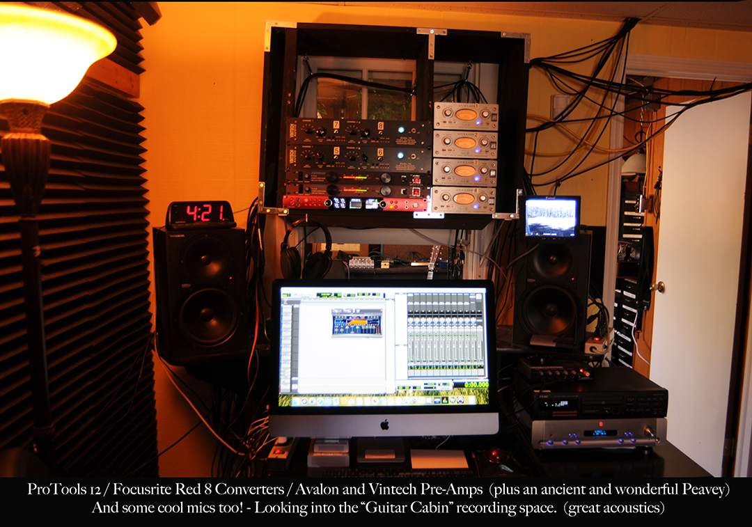 Control room features 4 Avalon Tube Pre-Amps & 4 channels of of Vintech Pre-Amps (designed to replicate 4 channels on a classic Neve console) and two channels of a wonderful ancient tube Peavy Microphone Pre-Amp that I've had rebuilt and "super charged". Converters are by Focusrite and my software is Pro-Tools Version 12 with Waves complete suite of plug ins on an independent server. And plenty of great microphones and high end cables and stuff.