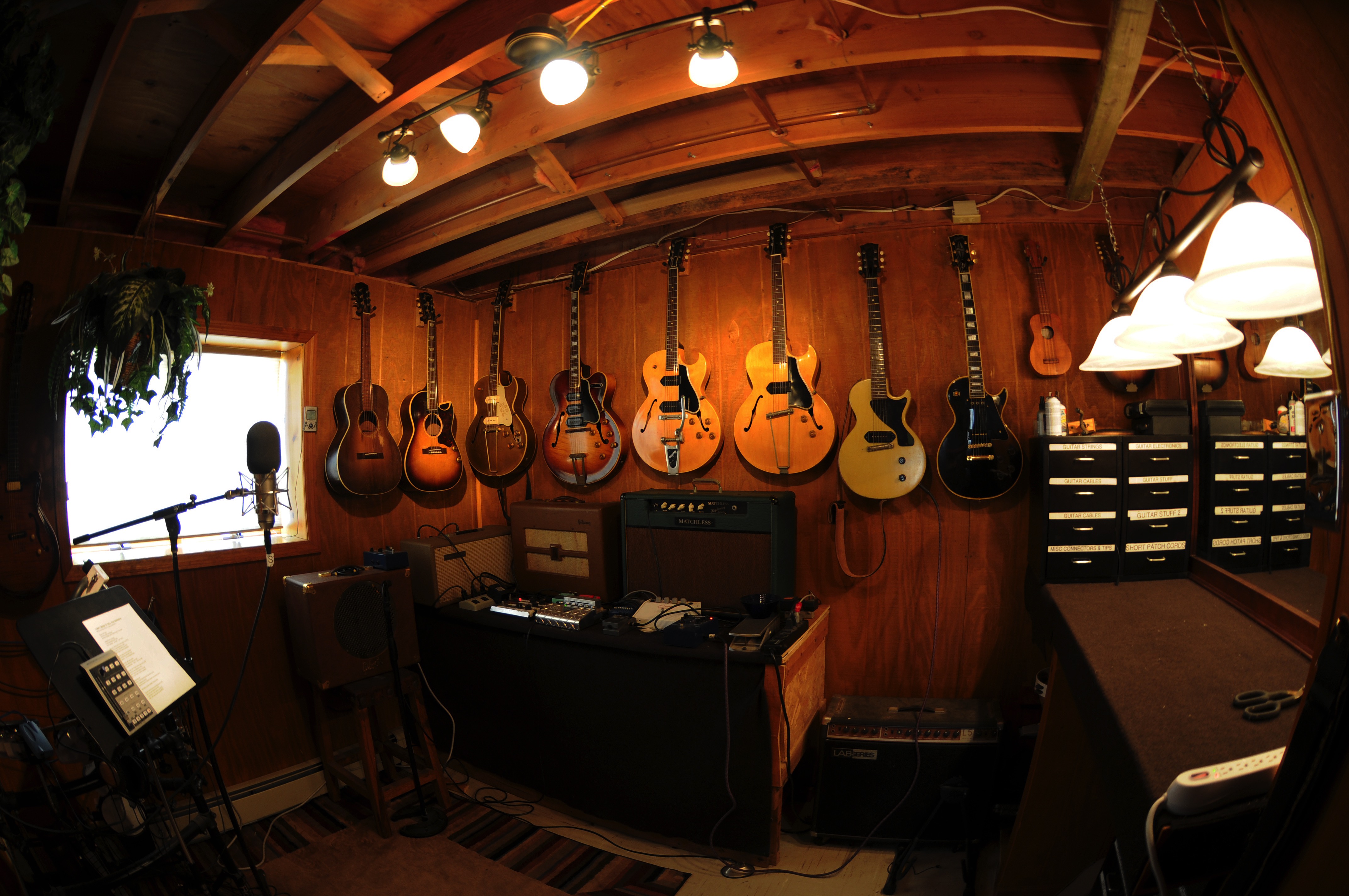 I also own around thirty terrific guitars and string instruments as well as a nice synthesizer set up (Roland soulds with Yamaha "weighted" keyboard controler) Unfortunately I don't have a "real" piano for stuff like Chopin. But for jazz or pop I have two terrific digital pianos... one from Yamaha and one from Kurzweil. Guests are encouraged to play whatever they feel like.